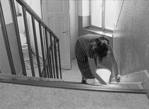 Die Protagonistin – die Künstlerin selbst – ist Mieterin in einem Wohnhaus. In Schwarz-Weiß-Bildern beobachten wir sie beim Betreten des Gebäudes, beim Blick aus dem Fenster, beim sorgfältigen Putzen im Hausflur sowie bei der akribischen Reinigung der Küche. Den szenischen Handlungen sind Botschaften zugeordnet, die die Vermieter auf dem Anrufbeantworter hinterlassen haben: Es geht um die Bereitstellung von Schlüsseln, das Abschließen von Türen, die mögliche Beschädigung von Stromleitungen. Befürchtungen und Misstrauen werden ausgedrückt und resultieren in wiederholten Anweisungen an die Mieterin: Sie möge doch bitte die Toilettentür abschließen und außerdem einen zweiten Schlüssel dafür nachmachen lassen. Der imaginären Bedrohung von Außen wird mit einem Ordnungssystem geantwortet, das Inklusion und Exklusion über Zugänge regelt und dabei vor allem die „Insassen“ isoliert und beschränkt. Die telefonischen Belehrungen des Vermieterehepaares finden ihre Spiegelung in der Zwanghaftigkeit der Putzhandlungen. Gleichzeitig wird dieser Konformismus mit visuellen Überzeichnungen konterkariert. Die gestreifte Bekleidung der Protagonistin erinnert zum Beispiel an die eines Sträflings. Und versinnbildlicht das Bestattungsinstitut im Vorderhaus nicht augenfällig die Abwesenheit des Lebens selbst?