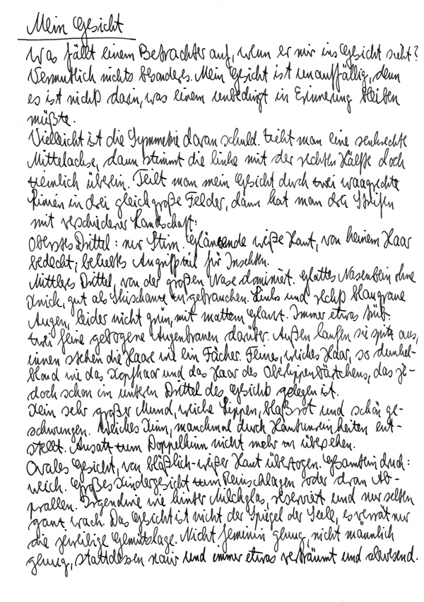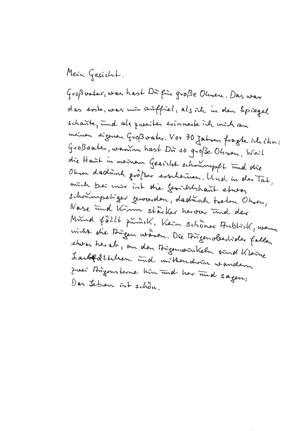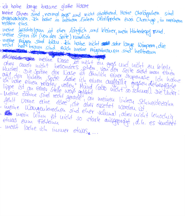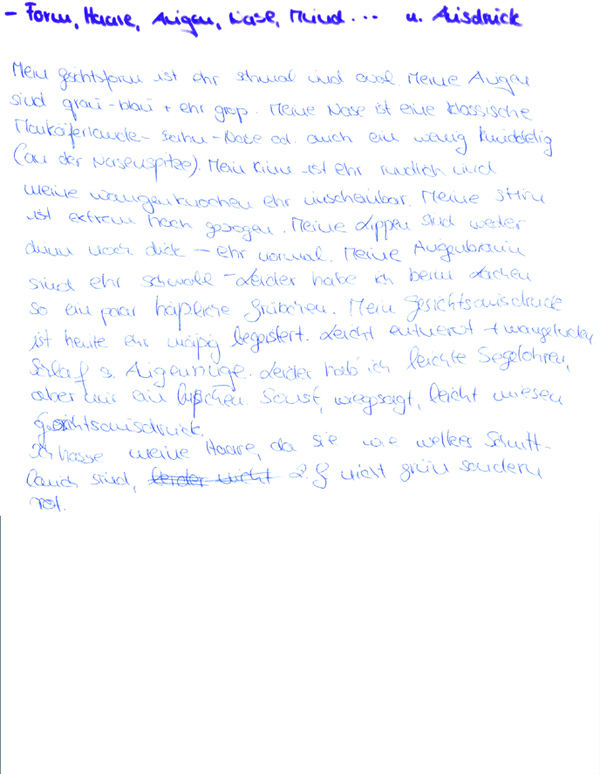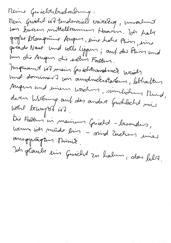 Eine Sammlung von 130 Gesichtsbeschreibungen, Buchprojekt Mit der Aufforderung, das eigene Gesicht handschriftlich zu beschreiben, habe ich Briefe an Freunde und Unbekannnte verschickt. Ein adressierter Freiumschlag lag bei.