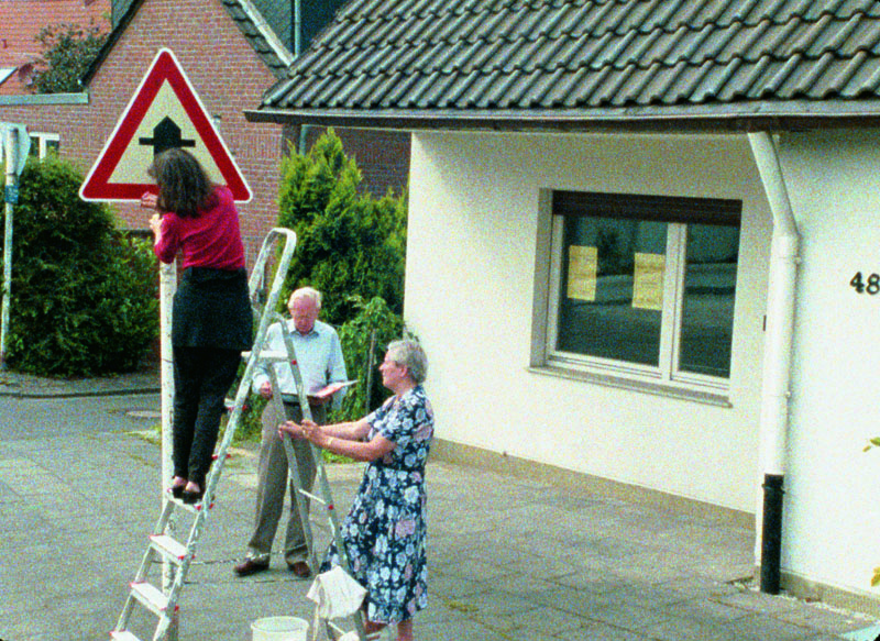 The camera pans slowly through the deserted streets of a middle-class suburb: singlefamily houses with nothing unusual about them, well tended gardens in front, fences, road signs. The voice of a young woman reports on the way her family spent their days when she was a child and how this was characterised by punctuality, exclusion, limitation and conformity. Her biographical narrative is related in a tone of emotional detachment: everything was ok. Finally the narrator reports on a ritual that she observes with her parents as their grown-up daughter: cleaning the local road signs. The pictures of the family cleaning them have been translated into the blend of documentary and staged aesthetic that is peculiarly the artist’s own. The personal environment is characterised by outside views and architectural delimitation markings from within and inwards. This report from everyday life in a family provides insights into the inner world of people who find their mirror-image both in architecture and in the absurd care taken of the road signs. The attempt motivated by fear to keep all evils of this world far fromoneself by assigning the highest value to the control mechanisms of private and public life, is further ironically commented on when the camera captures a wanted poster while it is tracking the cleaning brigade.
