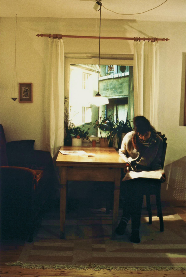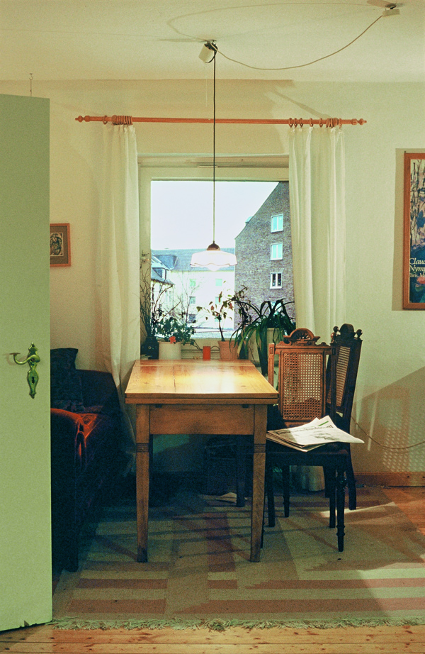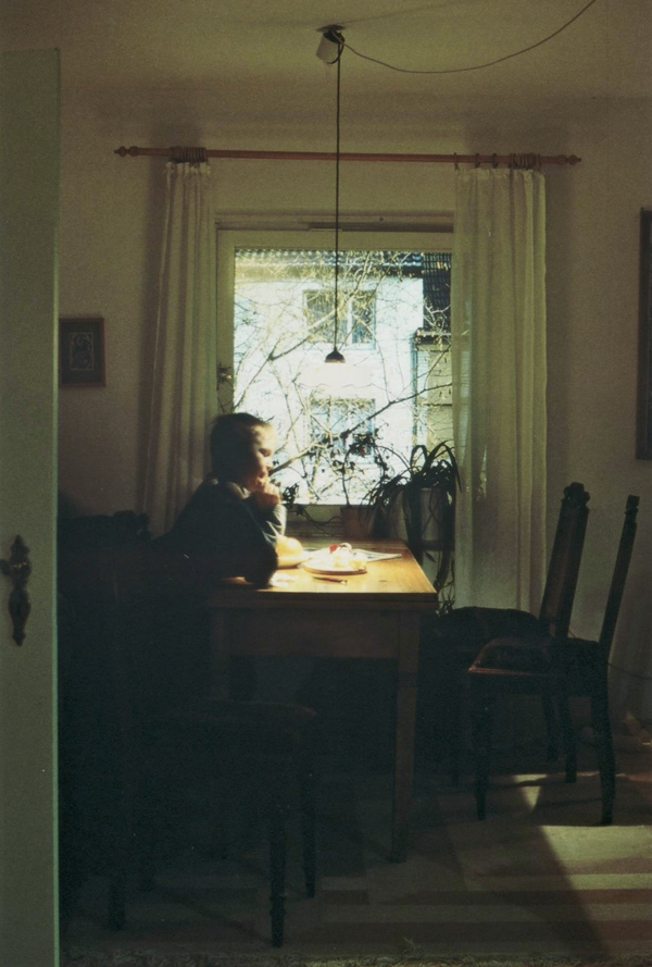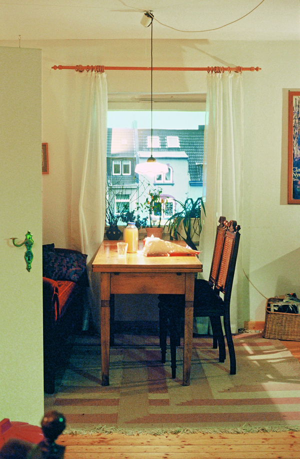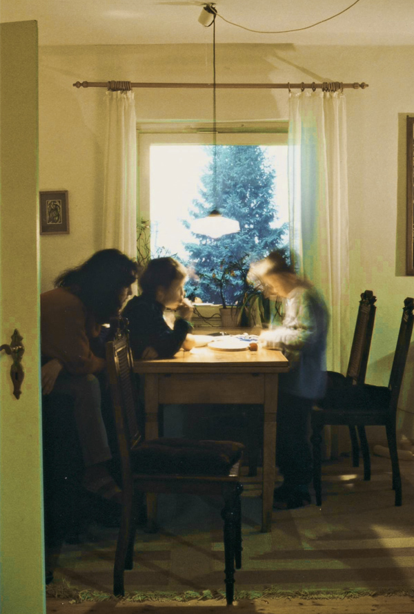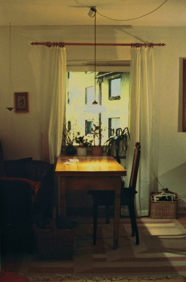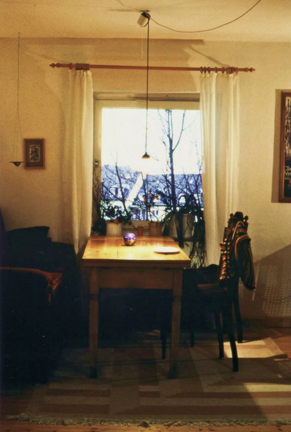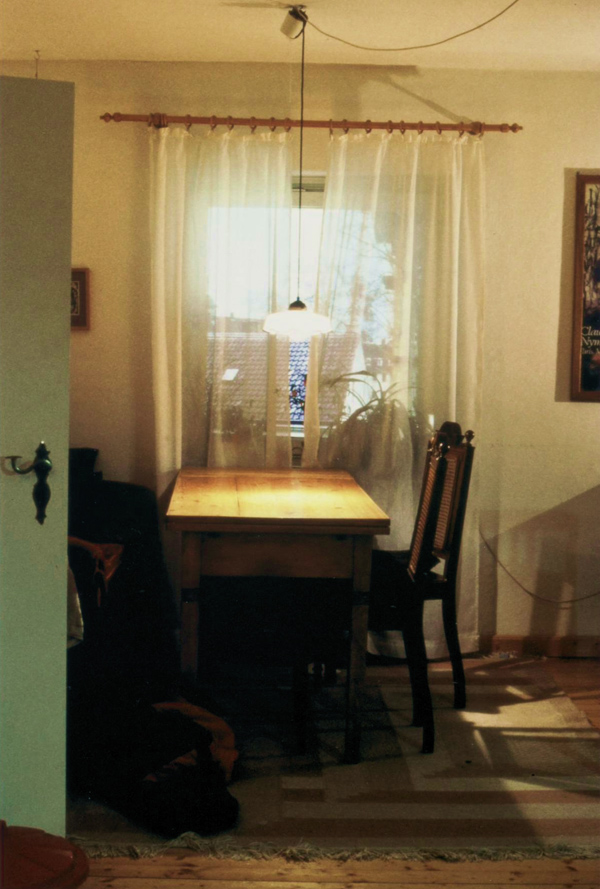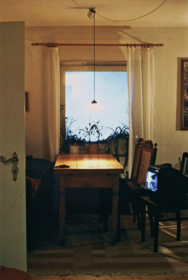 Die Dias zeigen ein Eßzimmer vor einem Fenster mit wechselndem Ausblick. Dieser bestimmt die Atmosphäre des Raumes. Das Eßzimmer ist bewohnt: außer dem Fensterausblick wechseln auch Personen und ihre alltäglichen Gebrauchsgegenstände.