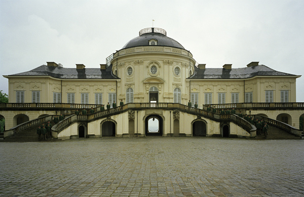 “I’m something special”: a graceful lady in court dress declaims this sentence in the late Baroque interior of Schloss Solitude in Stuttgart. A chorus of male voices answers her from the castle stair: “We love you”. A monotonous yet grotesque litany is created, that acquires a rather neurotic note in being so repetitious. Reduction to two camera settings, which strictly track the two axes of the Baroque interior, enhances the impression. The prologue is a sequence in which a child, also in court dress, leads the viewer into this absurd scenario. In the end banality breaks into the artificially generated tension as ironic relief.