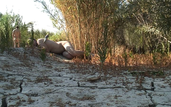 „Sunland“: A camera is scanning the environment: a naked man steps out of a „primeval forest“, a bird sits on his hand. Cut. Next sequence. A second man crouches on the sandy soil. The connecting link between them is this animal, which, even in this fictional paradise, depends on human beings. We find ourselves back in myth: Schnitt rewrites the story of Creation. But this time the first humans are male. Who could be Eve, who Adam? Both men care for this cockatiel, for having own offspring is not (yet) possible (and maybe it isn't necessary at all?). The viewer finds him- or herself caught in the structures of society: Schnitt is re-interpreting a culturally anchored image. We attempt to re-assign the parts in our minds. But the recognition of the apparently iconographic tradition allows us to raise questions: How does it feel not to fit in this concept of life? And who determines the concept?